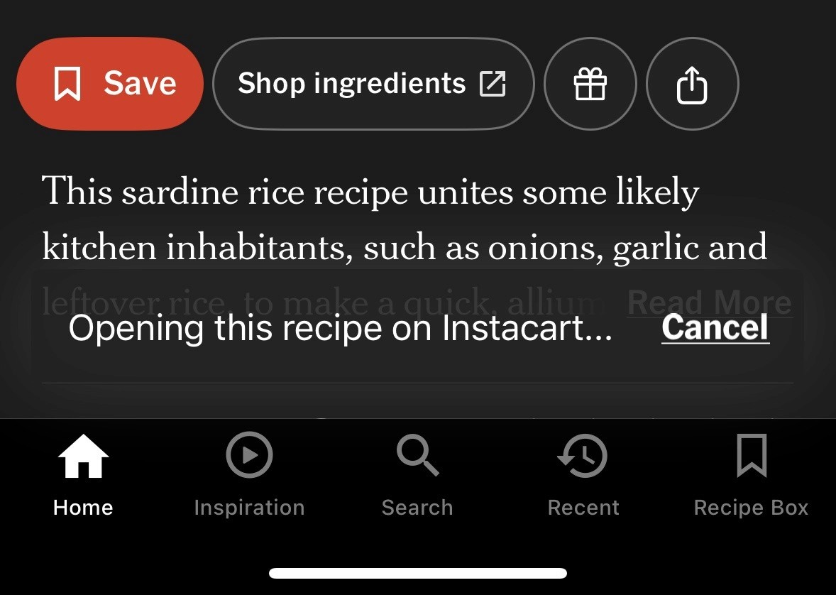 With all due respect to the team at NYT Cooking, the "shop ingredients" button that deeplinks to Instacart is my personal enemy
